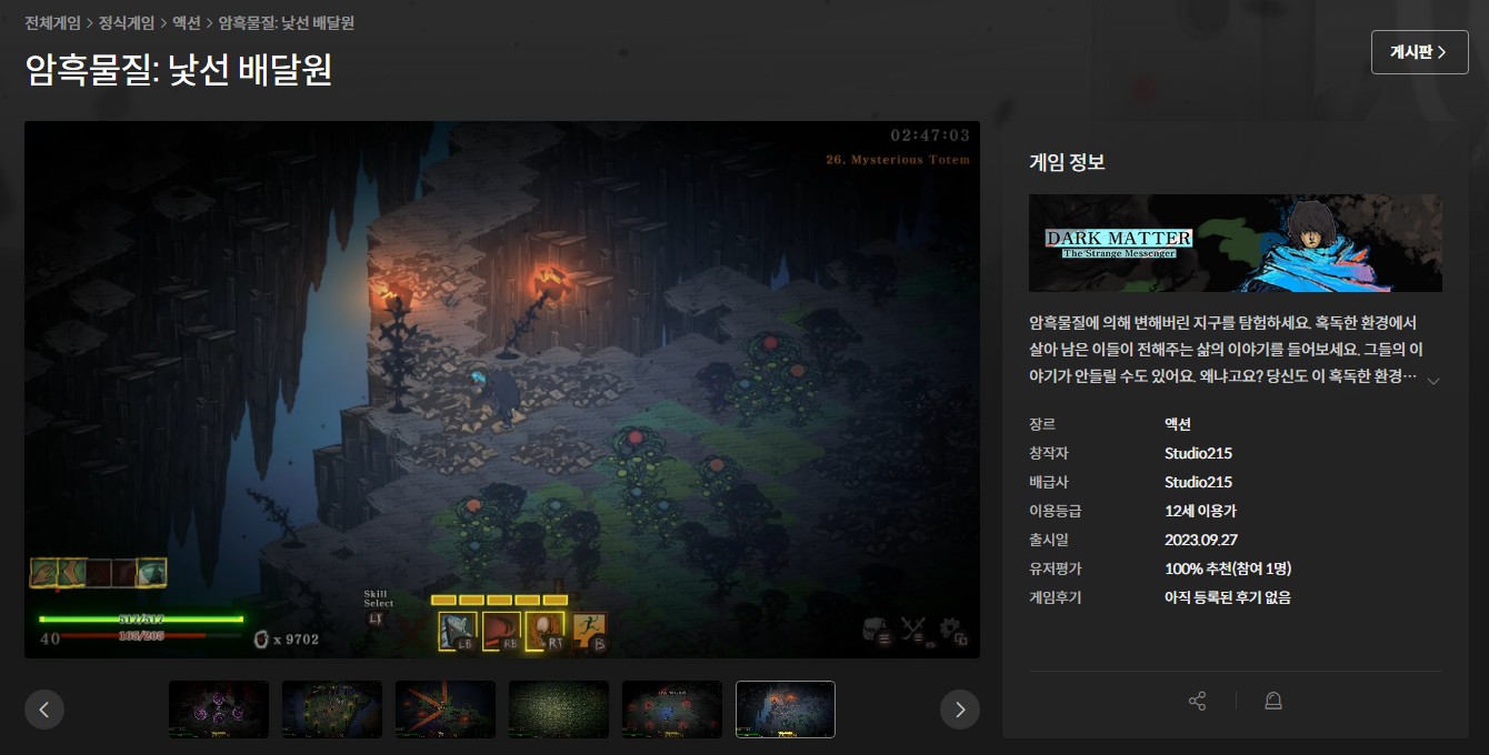암흑물질에 의해 변해버린 지구를 무대로 암흑물질의 정체를 파악하기 위해 모험을 펼치는 주인공의 이야기를 따라가볼 수 있는 게임, 암흑물질: 낯선 배달원이 23년 9월 27일 스토브 인디에서 정식으로 서비스를 시작했습니다. 스테이지를 돌파해나가는 액션 게임이자 구성 요소들을 빠르게 파악해 풀어나가는 암기형 게임으로 나름의 매력을 보여주고 있는 암흑물질: 낯선 배달원이 어떤 게임인지 한 번 즐겨보고 왔어요