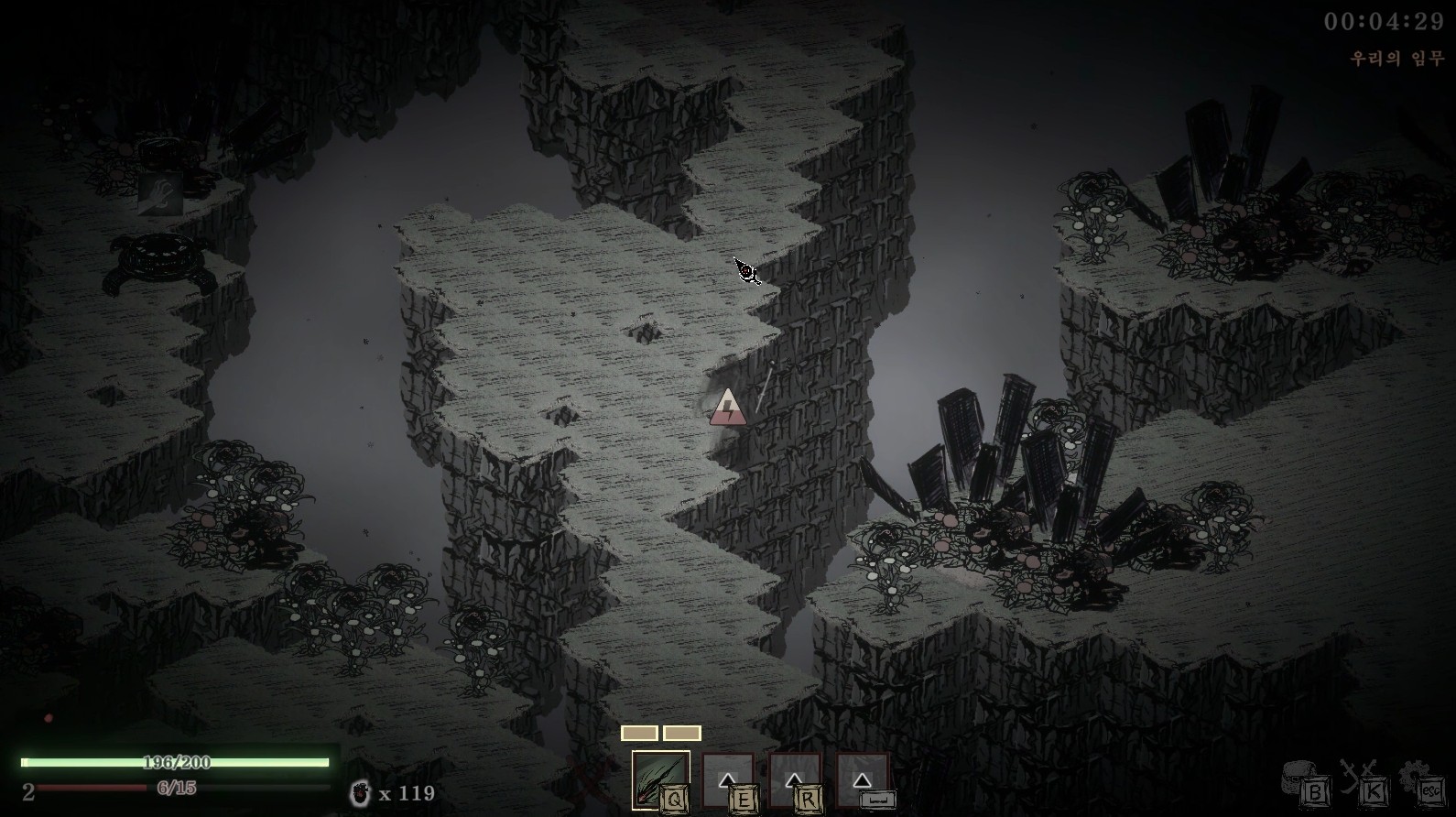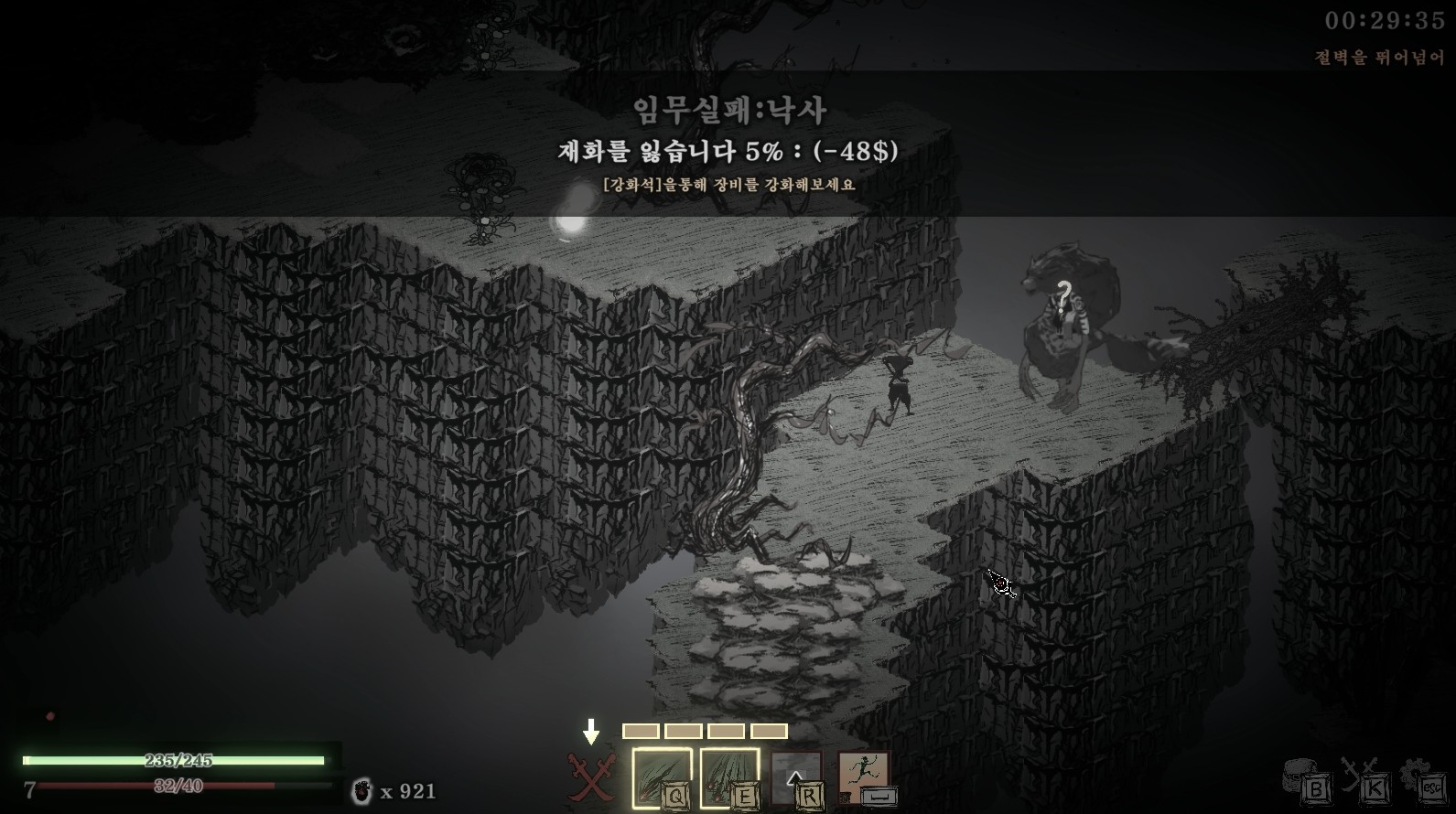일반 몬스터나 보스도 충분한 위협이지만 암흑물질: 낯선 배달원에서 유저들을 위협하는 가장 큰 요소는 바로 '낙사'입니다. 절벽 위에서 진행되는 게임이라 잘못 발을 내딛으면 얄짤없이 떨어져 죽어버리기 때문에 적의 공격을 피하는 동시에 떨어지지 않는 자리를 계속해서 찾아나가야 하고 단순히 이동하는 과정에서도 조금 굴곡있는 구간이라면 천천히 움직여야 다시 마지막 저장 포인트에서 출발하는 참사를 방지할 수 있어요