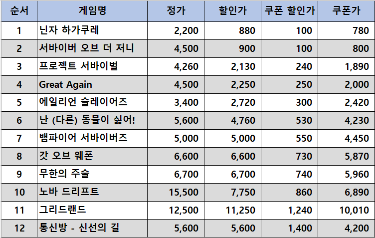 | 순서 | 게임명 | 정가 | 할인가 | 쿠폰할인가 | 쿠폰가 | 링크 |