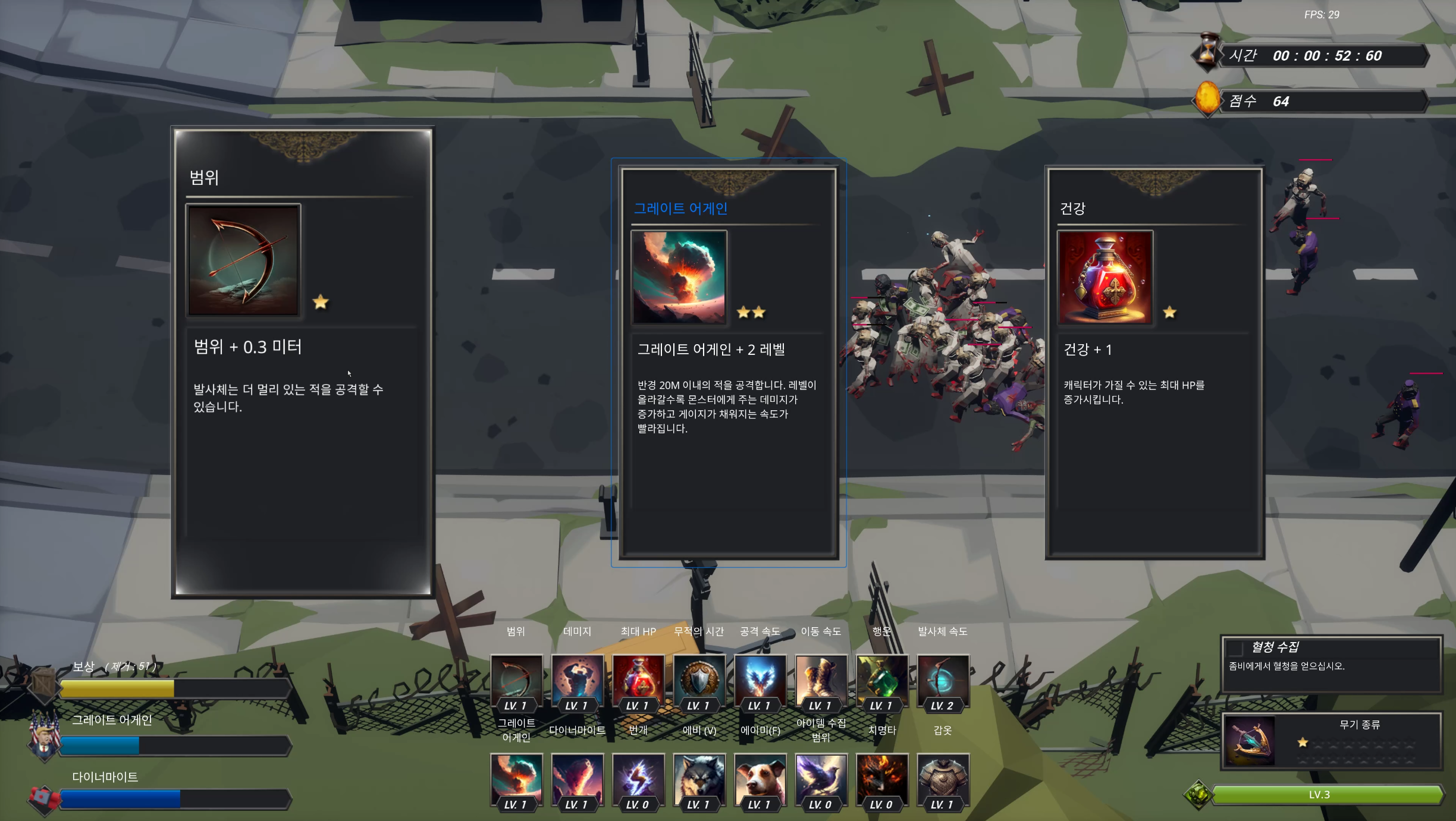 우측 하단 게이지가 차거나, 보상 상자가 꽉 차면 스킬을 선택할 수 있습니다.