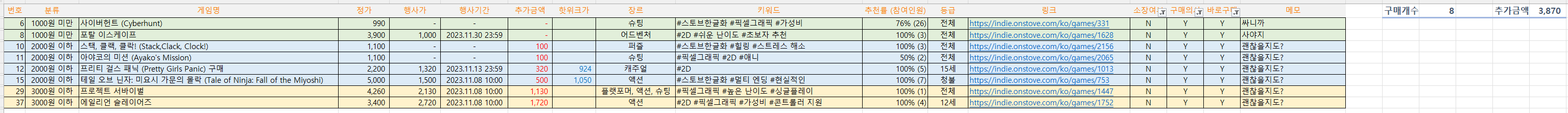 사진까지 넣었으면 좋겠지만, 일이 너무 커져서 게임명, 추가 금액, 장르, 키워드, 평가랑 (참여자), 등급, 바로가기 링크 등 편의기능을 최대한 넣어봤습니다.