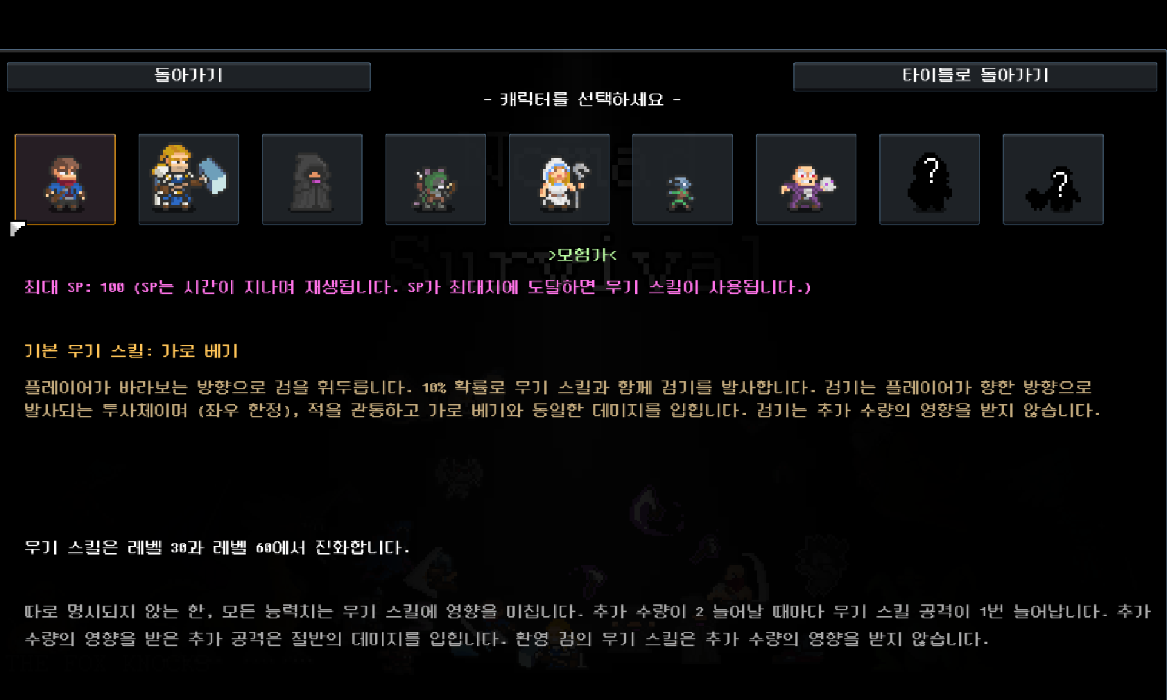지금까지 해금한 캐릭터는 모험가, 십자군, 광신도, 생쥐 궁수, 성자, 퀵링, 강령술사 입니다.