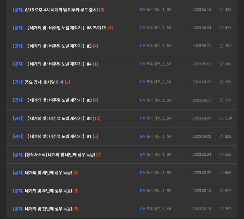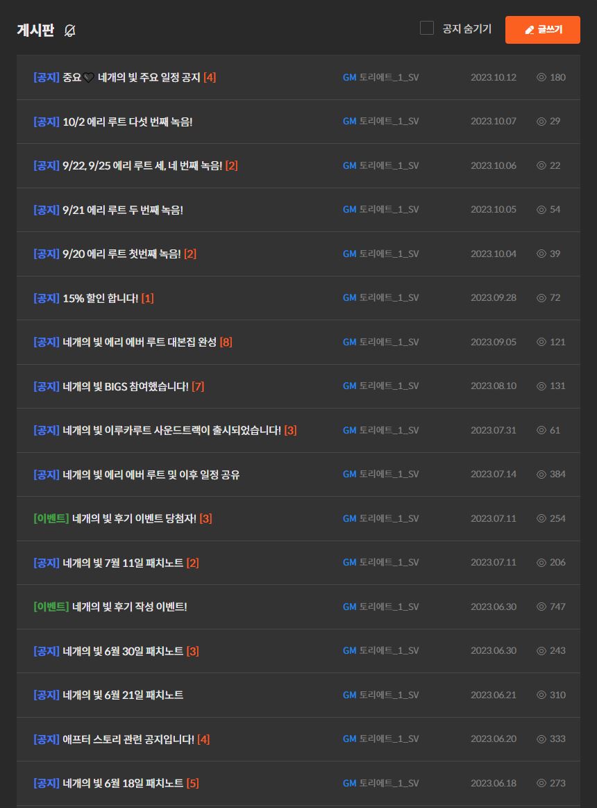 이런 게시판이 더 있는진 모르겠지만 일단 네개의 빛 게시판은 공지가 전부 등록돼있어서 일반 게시글 보려면 쭉 내려야 되네요 ㄷㄷ