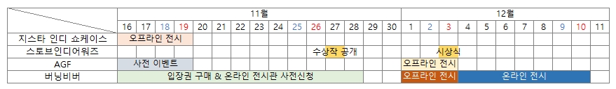 그동안의 노력이 결실을 맺어 스토브인디가 올해부터 많은 게임 행사에 참여하고 있습니다. 특히 연말에는 행사가 몰려있고요.