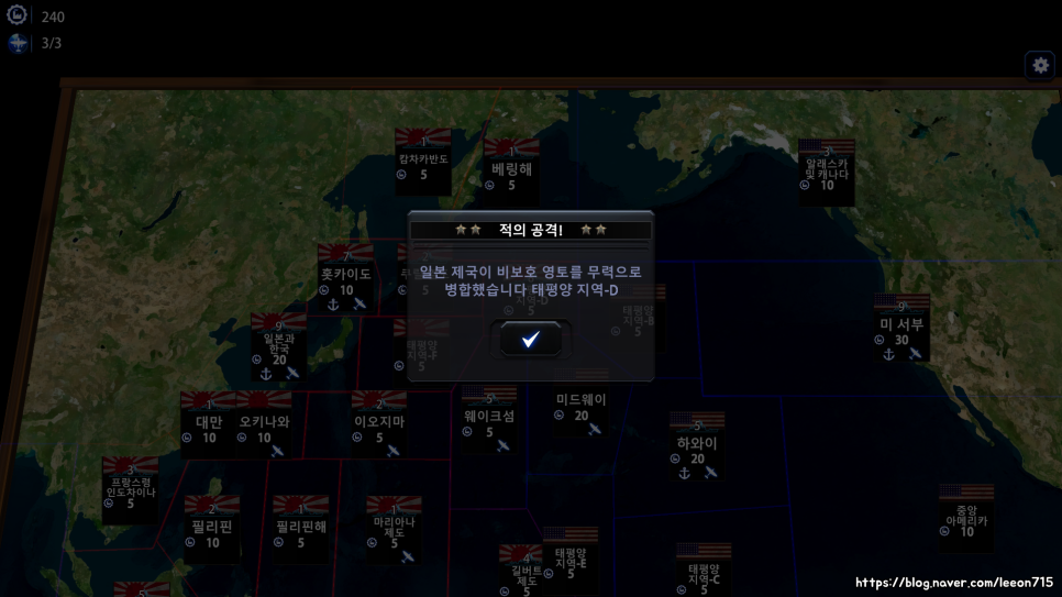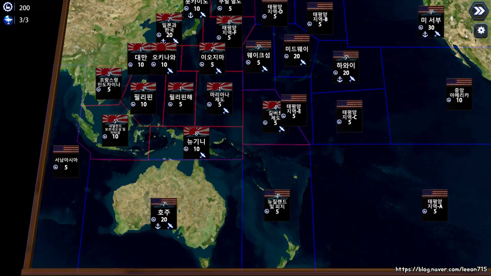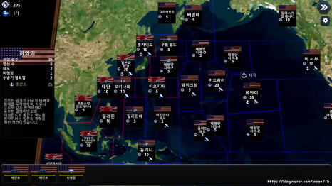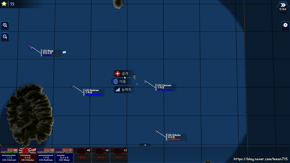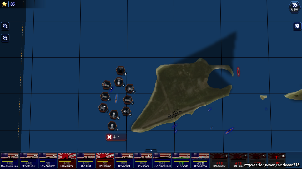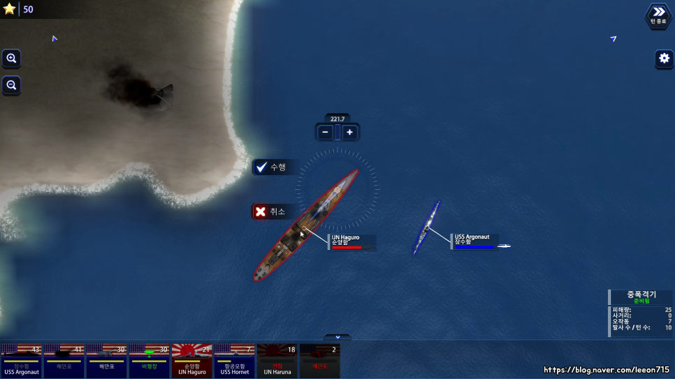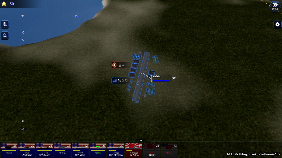 배틀 페이즈로 넘어가면 침입한 함대와 주둔하고 있는 함대가 맞붙게 됩니다. 이 때 방어하는 쪽은 해당 섬의 공항, 해안포를 활용할 수 있습니다. 방어하는 쪽이 유리한 전투 환경을 그대로 구현했습니다.