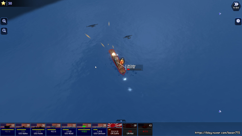 또한 전투 함대 2는 항공모함과 공항에서 이륙하는 항공기로 적 함대를 공습할 수도 있는데요. 사거리가 포탑보다 길기 때문에 상당히 유용합니다. 대신에 함선에 대공 포탑을 기용하면 공습을 일정 확률로 상쇄할 수 있기도 해요.