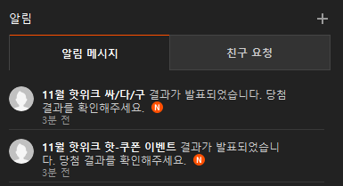 핫위크 핫쿠폰은 참여자 전원 주는 거라 이거 줄 때 됐는데 하면서 기다렸는데 알람이 하나 더..?!