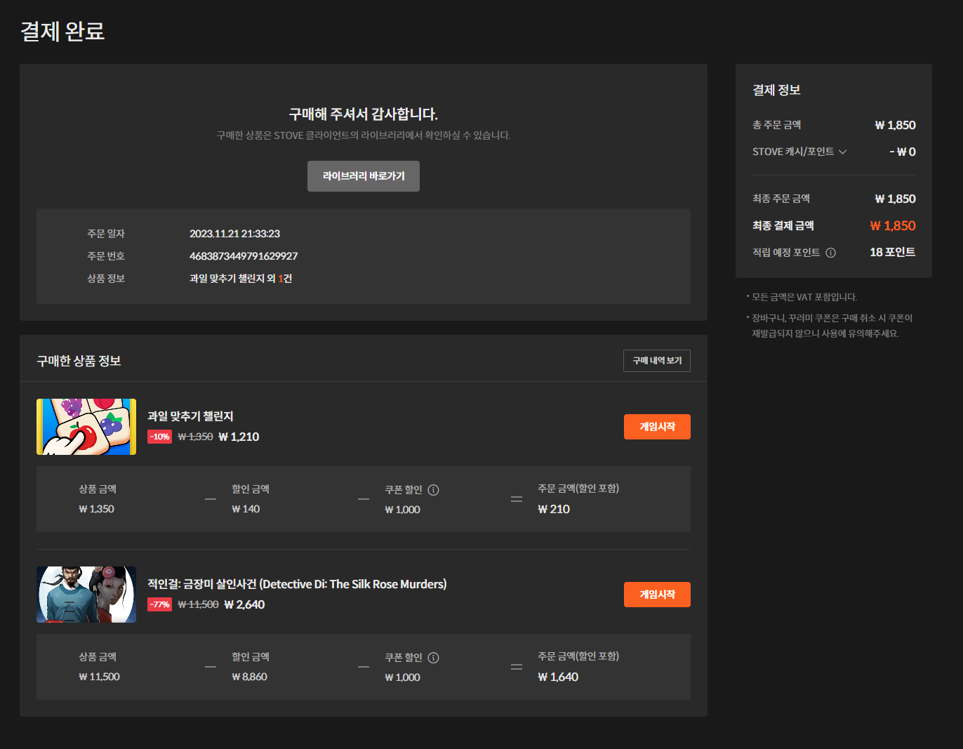 오늘도 인디게임 1,000원 할인 쿠폰 알차게 사용했네요.