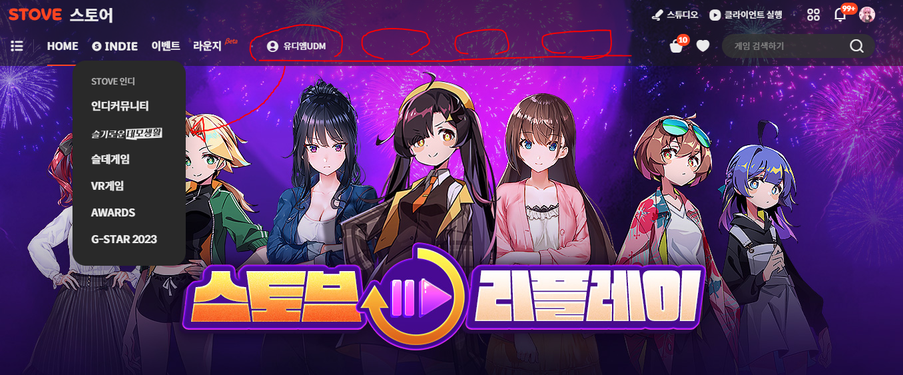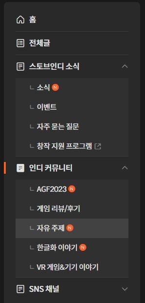일단 가장 눈에 띄는 것은 상단에 있던 메뉴들이 대부분 INDIE 탭으로 들어가게 되었어요. 이게, 전에는 스토브 인디 페이지에서 인디커뮤니티나 슬기로운 데모생활로 가는 동선이 엄청 길었어서 어떻게든 눈에 잘 띄게 하면 좋을 것 같다고 했었던 부분이었거든요. 그런데 이게 다시 숨겨진... 예전의 피드백이 롤백 된 것이라 볼 수 있지요.